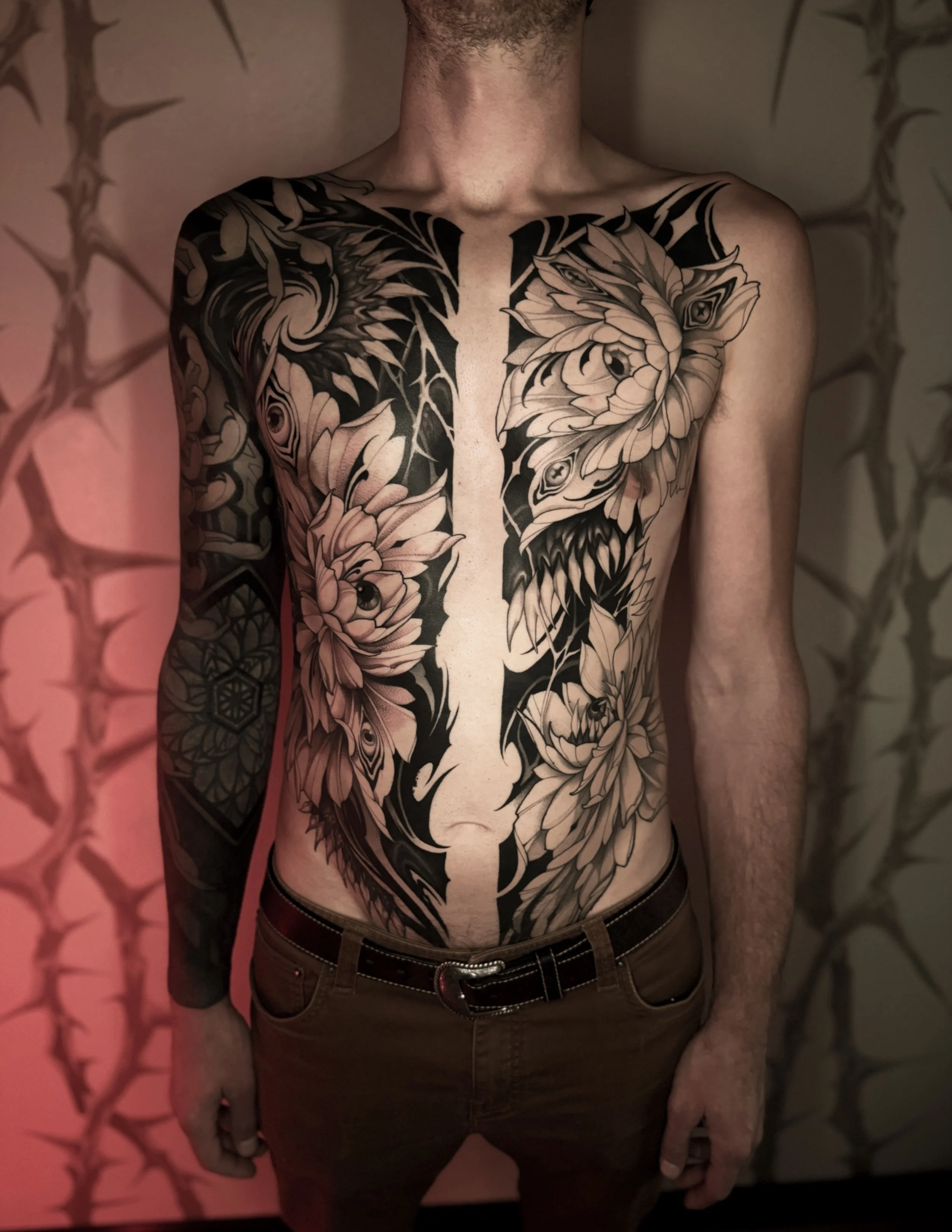 Patience and discipline is important to my creative process, and I am continuously exploring ways to translate illustrative designs into tattooing compositions.
